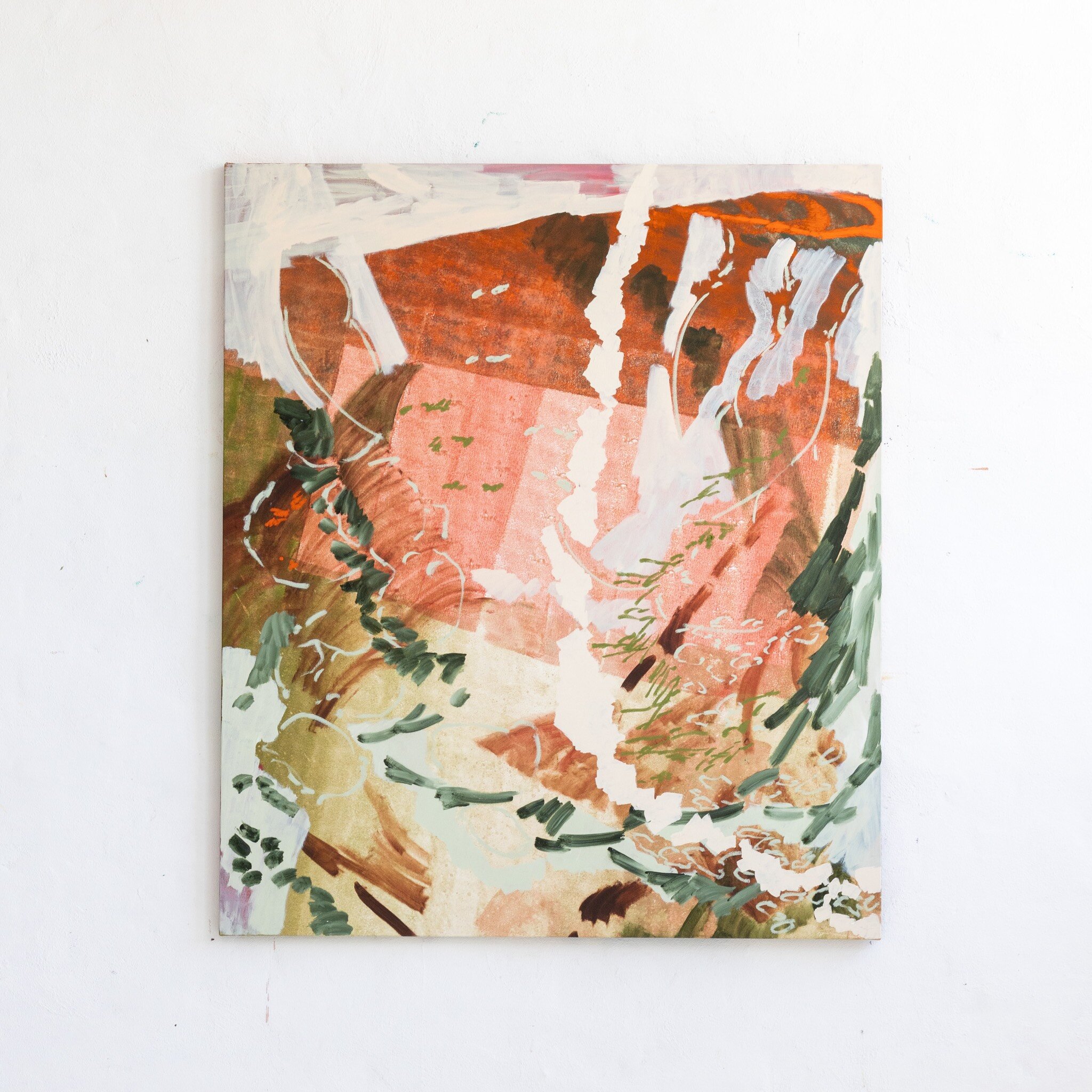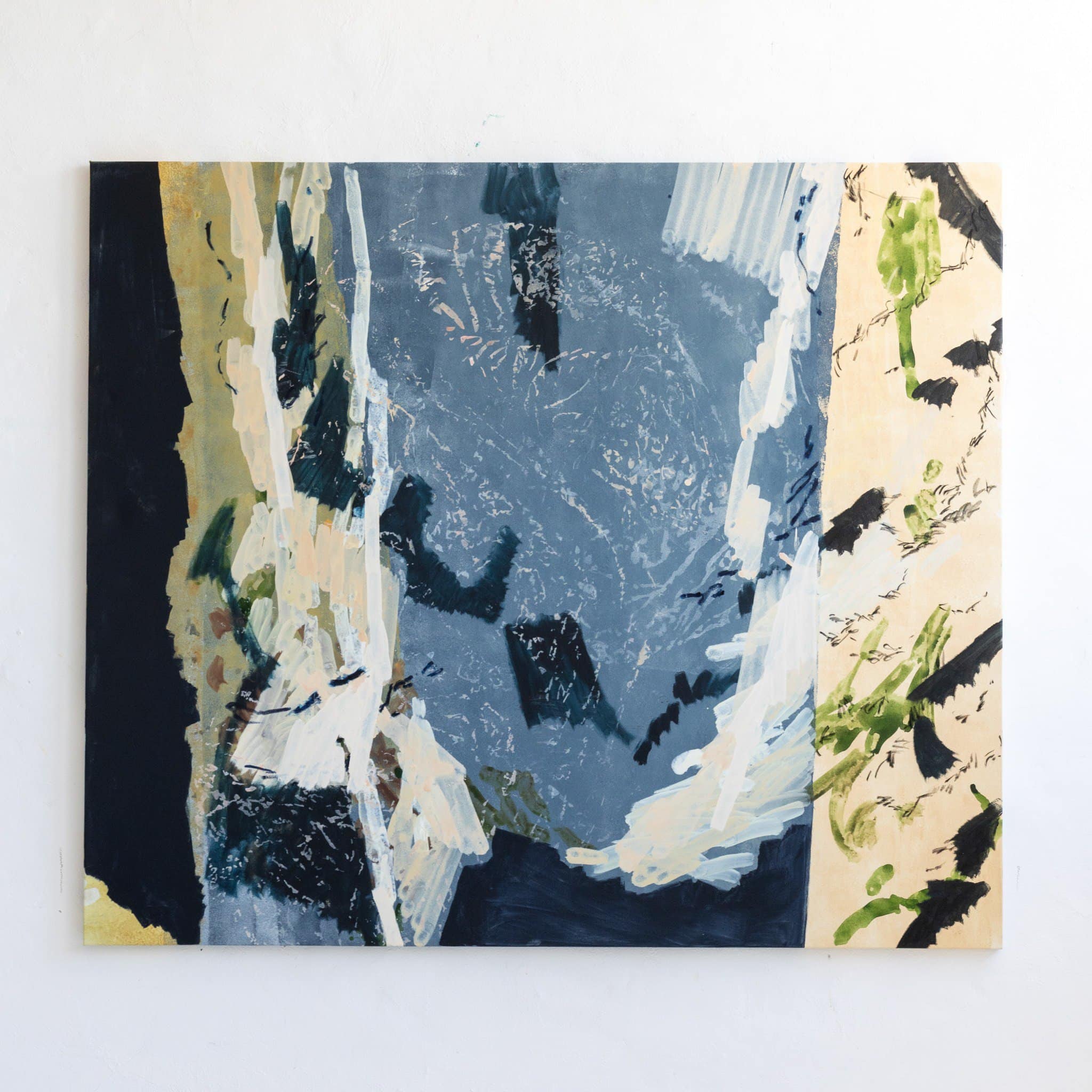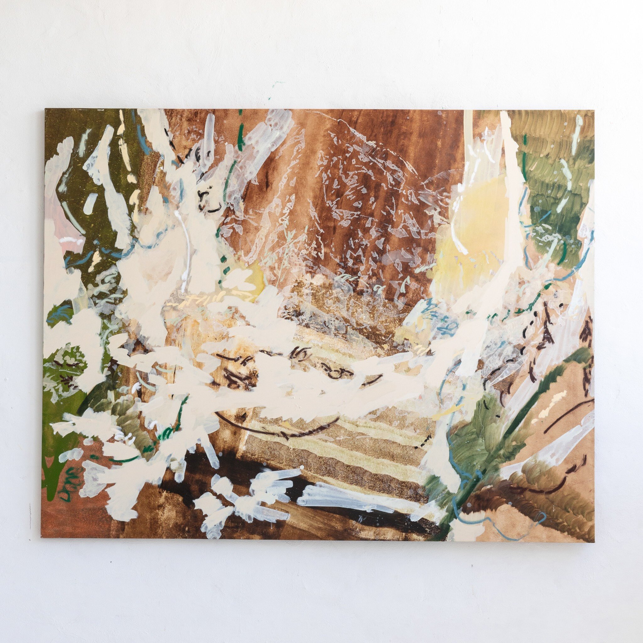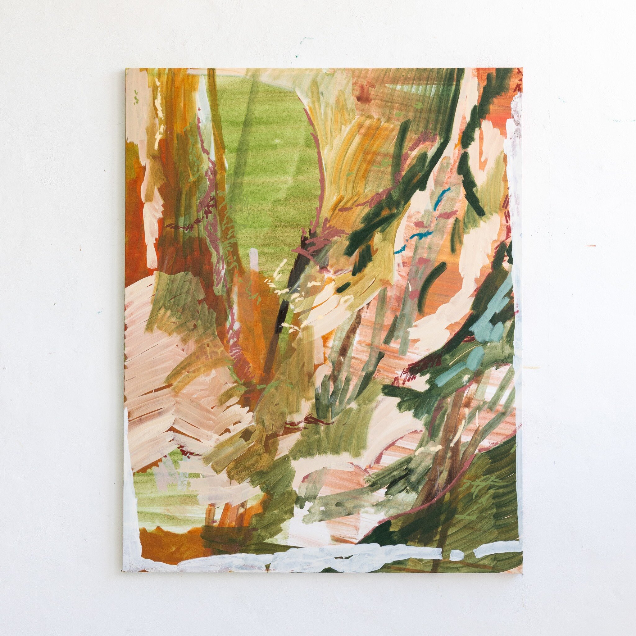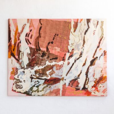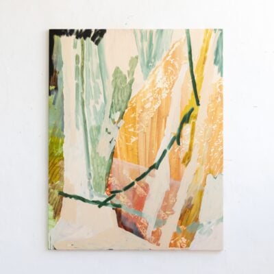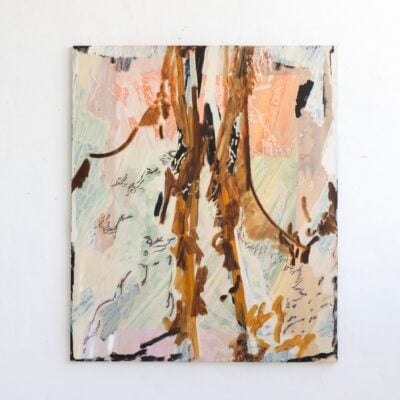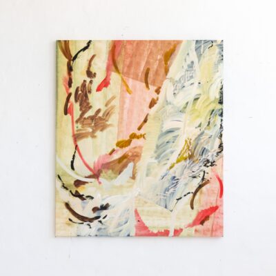 Her repeated abstract marks are sometimes reminiscent of Australian landscapes, sometimes of mysterious forests. Nature is one of her biggest inspirations, and her works are often based on beautiful nature areas she has recently experienced. The large, dynamic and gestural brushstrokes that define her paintings hearken back to the Abstract Expressionism of the 1940s and 1950s. To the Abstract Expressionists like Willem de Kooning, Jackson Pollock and Mark Rothko, the act of mark making was of prime importance; pouring or violently brushing the paint onto the canvas, their works show the physical work of the body needed to produce a work of art. This tradition broke with the norm of previous centuries which was to try and eliminate visible brushstrokes and create a painting that is a perfect illusion of three-dimensionality – like a window through which you look out at the scene. Like the Abstract Expressionists, Ash Holmes emphasizes the physical nature of the artwork and the materials used to create it, but while her predominantly male predecessors used dark and often very saturated primary colors, her delicate color palette elevates the gestural marks to create a new, more light and airy kind of abstract art.