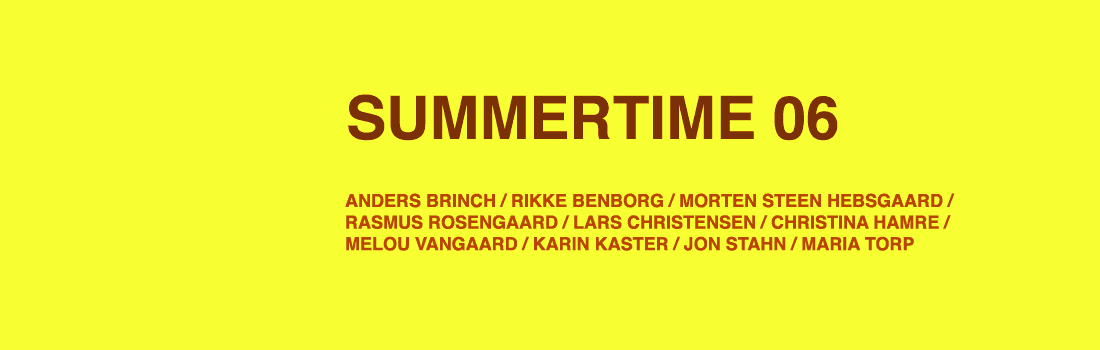 Summertime 06 / Group Exhibition 23 Jun 2006 Anders Brinch (DK), Christina Hamre (DK), Jon Stahn (DK), Karin Kaster (DK), Lars Christensen (DK), Maria Torp (DK), Melou Vanggaard (DK), Morten Steen Hebsgaard (DK), Rasmus Rosengaard (DK), Rikke Benborg (DK)
